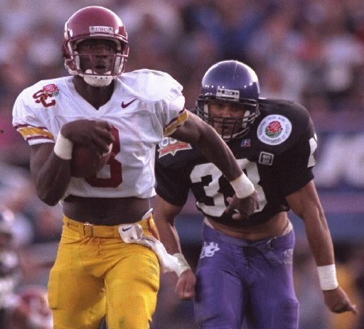 Keyshawn Johnson was a local kid from Los Angeles who rose above the prevalent gang culture in LA and became a star for the hometown USC Trojans. Johnson was almost a “what could have been” story but was able to turn his life around via football. After spending the beginning of his college career at West Los Angeles College, he performed well enough to earn a transfer to Southern Cal where he played two seasons earning All-American honors both years and winning PAC-10 Offensive Player of the Year in 1995. Keyshawn was one of the biggest stars at receiver in college football history. He even appeared on episode of the popular television show Coach while still at USC. Johnson was tabbed as a can’t miss NFL prospect and was drafted 1st overall by the New York Jets in the 1996 NFL draft. He makes his appearance on my list due to his superstar status and his stellar performances in two Rose Bowls.